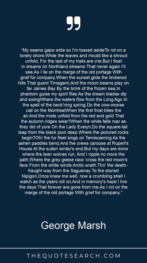 “My seams gape wide so I'm tossed asideTo rot on a lonely shore,While the leaves and mould like a shroud unfold, For the last of my trails are o'er,But I float in dreams on Northland streams That never again I'll see,As I lie on the marge of the old portage With grief for company.When the sunset gilds the timbered hills That guard Timagami,And the moon beams play on far James Bay By the brink of the frozen sea,In phantom guise my spirit flies As the dream blades dip and swingWhere the waters flow from the Long Ago In the spell of the beck'ning spring.Do the cow-moose call on the MontrealWhen the first frost bites the air,And the mists unfold from the red and gold That the autumn ridges wear?When the white falls roar as they did of yore On the Lady Evelyn,Do the square-tail leap from the black pool deep Where the pictured rocks begin?Oh! the fur fleet sings on Temiscaming As the ashen paddles bend,And the crews carouse at Rupert's House At the sullen winter's end;But my days are done where the lean wolves run, And I ripple no more the path,Where the grey geese race 'cross the red moon's face From the white winds Arctic wrath.Tho' the death-fraught way from the Saguenay To the storied Nipigon,Once knew me well, now a crumbling shell I watch as the years roll on,And in memory's haze I live the days That forever are gone from me,As I rot on the marge of the old portage With grief for company.”