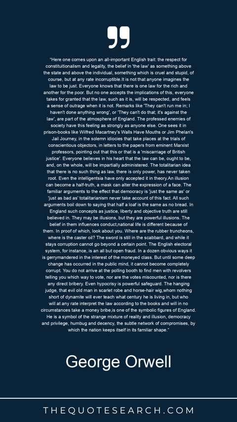 “Here one comes upon an all-important English trait: the respect for constituitionalism and legality, the belief in 'the law' as something above the state and above the individual, something which is cruel and stupid, of course, but at any rate incorruptible.It is not that anyone imagines the law to be just. Everyone knows that there is one law for the rich and another for the poor. But no one accepts the implications of this, everyone takes for granted that the law, such as it is, will be respected, and feels a sense of outrage when it is not. Remarks like 'They can't run me in; I haven't done anything wrong', or 'They can't do that; it's against the law', are part of the atmosphere of England. The professed enemies of society have this feeling as strongly as anyone else. One sees it in prison-books like Wilfred Macartney's Walls Have Mouths or Jim Phelan's Jail Journey, in the solemn idiocies that take places at the trials of conscientious objectors, in letters to the papers from eminent Marxist professors, pointing out that this or that is a 'miscarriage of British justice'. Everyone believes in his heart that the law can be, ought to be, and, on the whole, will be impartially administered. The totalitarian idea that there is no such thing as law, there is only power, has never taken root. Even the intelligentsia have only accepted it in theory.An illusion can become a half-truth, a mask can alter the expression of a face. The familiar arguments to the effect that democracy is 'just the same as' or 'just as bad as' totalitarianism never take account of this fact. All such arguments boil down to saying that half a loaf is the same as no bread. In England such concepts as justice, liberty and objective truth are still believed in. They may be illusions, but they are powerful illusions. The belief in them influences conduct,national life is different because of them. In proof of which, look about you. Where are the rubber truncheons, where is the caster oil? The sword is still in the scabbard, and while it stays corruption cannot go beyond a certain point. The English electoral system, for instance, is an all but open fraud. In a dozen obvious ways it is gerrymandered in the interest of the moneyed class. But until some deep change has occurred in the public mind, it cannot become completely corrupt. You do not arrive at the polling booth to find men with revolvers telling you which way to vote, nor are the votes miscounted, nor is there any direct bribery. Even hypocrisy is powerful safeguard. The hanging judge, that evil old man in scarlet robe and horse-hair wig,whom nothing short of dynamite will ever teach what century he is living in, but who will at any rate interpret the law according to the books and will in no circumstances take a money bribe,is one of the symbolic figures of England. He is a symbol of the strange mixture of reality and illusion, democracy and privilege, humbug and decency, the subtle network of compromises, by which the nation keeps itself in its familiar shape.”