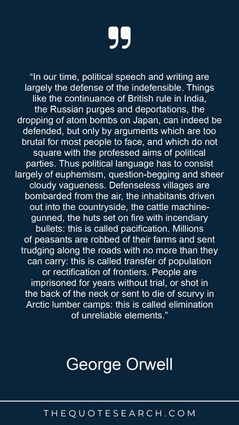 “In our time, political speech and writing are largely the defense of the indefensible. Things like the continuance of British rule in India, the Russian purges and deportations, the dropping of atom bombs on Japan, can indeed be defended, but only by arguments which are too brutal for most people to face, and which do not square with the professed aims of political parties. Thus political language has to consist largely of euphemism, question-begging and sheer cloudy vagueness. Defenseless villages are bombarded from the air, the inhabitants driven out into the countryside, the cattle machine-gunned, the huts set on fire with incendiary bullets: this is called pacification. Millions of peasants are robbed of their farms and sent trudging along the roads with no more than they can carry: this is called transfer of population or rectification of frontiers. People are imprisoned for years without trial, or shot in the back of the neck or sent to die of scurvy in Arctic lumber camps: this is called elimination of unreliable elements.”