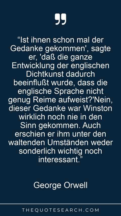“Ist ihnen schon mal der Gedanke gekommen', sagte er, 'daß die ganze Entwicklung der englischen Dichtkunst dadurch beeinflußt wurde, dass die englische Sprache nicht genug Reime aufweist?'Nein, dieser Gedanke war Winston wirklich noch nie in den Sinn gekommen. Auch erschien er ihm unter den waltenden Umständen weder sonderlich wichtig noch interessant.”