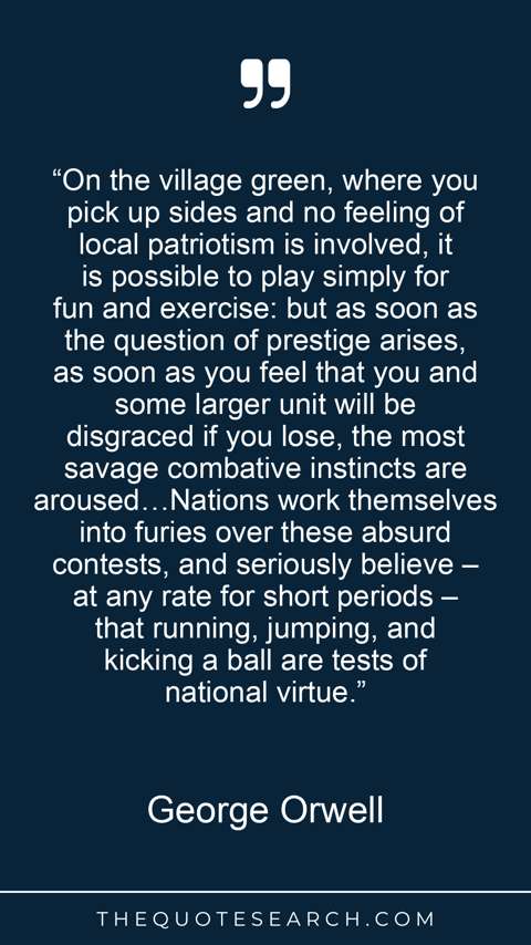 “On the village green, where you pick up sides and no feeling of local patriotism is involved, it is possible to play simply for fun and exercise: but as soon as the question of prestige arises, as soon as you feel that you and some larger unit will be disgraced if you lose, the most savage combative instincts are aroused…Nations work themselves into furies over these absurd contests, and seriously believe – at any rate for short periods – that running, jumping, and kicking a ball are tests of national virtue.”