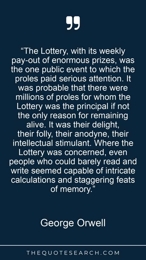 “The Lottery, with its weekly pay-out of enormous prizes, was the one public event to which the proles paid serious attention. It was probable that there were millions of proles for whom the Lottery was the principal if not the only reason for remaining alive. It was their delight, their folly, their anodyne, their intellectual stimulant. Where the Lottery was concerned, even people who could barely read and write seemed capable of intricate calculations and staggering feats of memory.”