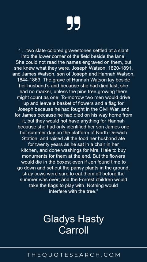 “….two slate-colored gravestones settled at a slant into the lower corner of the field beside the lane. She could not read the names engraved on them, but she knew what they were. Joseph Watson, 1820-1891, and James Watson, son of Joseph and Hannah Watson, 1844-1863. The grave of Hannah Watson lay beside her husband’s and because she had died last, she had no marker, unless the pine tree growing there might count as one. To-morrow two men would drive up and leave a basket of flowers and a flag for Joseph because he had fought in the Civil War, and for James because he had died on his way home from it, but they would not have anything for Hannah because she had only identified her son James one hot summer day on the platform of North Derwich Station, and raised all the food her husband ate for twenty years as he sat in a chair in her kitchen, and done washings for Mrs. Hale to buy monuments for them at the end. But the flowers would die in the boxes; even if Jen found time to go down and set out the pansy plants in the ground, stray cows were sure to eat them off before the summer was over; and the Forrest children would take the flags to play with. Nothing would interfere with the tree.”