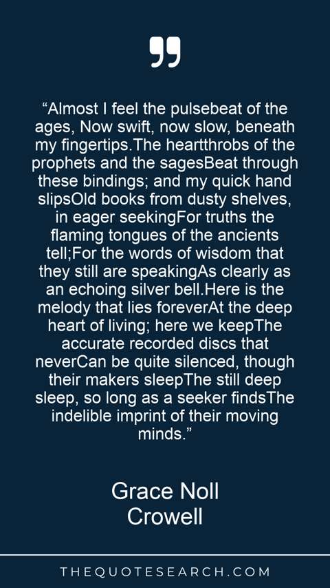 “Almost I feel the pulsebeat of the ages, Now swift, now slow, beneath my fingertips.The heartthrobs of the prophets and the sagesBeat through these bindings; and my quick hand slipsOld books from dusty shelves, in eager seekingFor truths the flaming tongues of the ancients tell;For the words of wisdom that they still are speakingAs clearly as an echoing silver bell.Here is the melody that lies foreverAt the deep heart of living; here we keepThe accurate recorded discs that neverCan be quite silenced, though their makers sleepThe still deep sleep, so long as a seeker findsThe indelible imprint of their moving minds.”