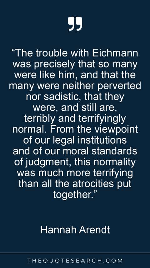“The trouble with Eichmann was precisely that so many were like him, and that the many were neither perverted nor sadistic, that they were, and still are, terribly and terrifyingly normal. From the viewpoint of our legal institutions and of our moral standards of judgment, this normality was much more terrifying than all the atrocities put together.”