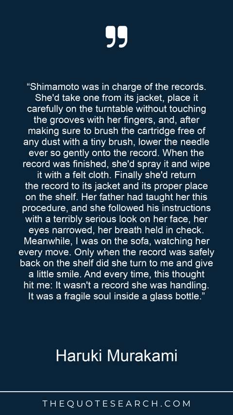“Shimamoto was in charge of the records. She'd take one from its jacket, place it carefully on the turntable without touching the grooves with her fingers, and, after making sure to brush the cartridge free of any dust with a tiny brush, lower the needle ever so gently onto the record. When the record was finished, she'd spray it and wipe it with a felt cloth. Finally she'd return the record to its jacket and its proper place on the shelf. Her father had taught her this procedure, and she followed his instructions with a terribly serious look on her face, her eyes narrowed, her breath held in check. Meanwhile, I was on the sofa, watching her every move. Only when the record was safely back on the shelf did she turn to me and give a little smile. And every time, this thought hit me: It wasn't a record she was handling. It was a fragile soul inside a glass bottle.”
