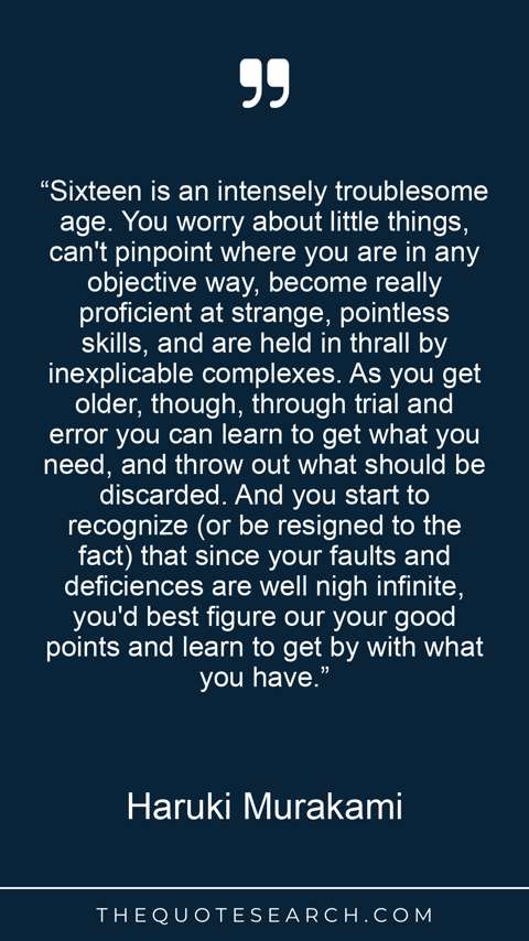 “Sixteen is an intensely troublesome age. You worry about little things, can't pinpoint where you are in any objective way, become really proficient at strange, pointless skills, and are held in thrall by inexplicable complexes. As you get older, though, through trial and error you can learn to get what you need, and throw out what should be discarded. And you start to recognize (or be resigned to the fact) that since your faults and deficiences are well nigh infinite, you'd best figure our your good points and learn to get by with what you have.”