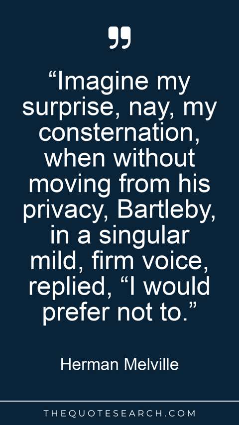 “Imagine my surprise, nay, my consternation, when without moving from his privacy, Bartleby, in a singular mild, firm voice, replied, “I would prefer not to.”