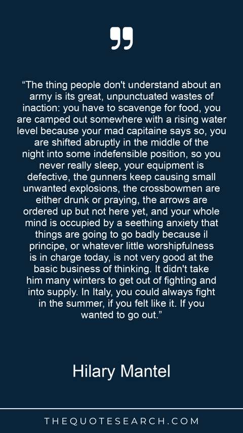 “The thing people don't understand about an army is its great, unpunctuated wastes of inaction: you have to scavenge for food, you are camped out somewhere with a rising water level because your mad capitaine says so, you are shifted abruptly in the middle of the night into some indefensible position, so you never really sleep, your equipment is defective, the gunners keep causing small unwanted explosions, the crossbowmen are either drunk or praying, the arrows are ordered up but not here yet, and your whole mind is occupied by a seething anxiety that things are going to go badly because il principe, or whatever little worshipfulness is in charge today, is not very good at the basic business of thinking. It didn't take him many winters to get out of fighting and into supply. In Italy, you could always fight in the summer, if you felt like it. If you wanted to go out.”