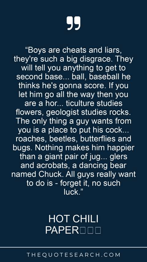 “Boys are cheats and liars, they're such a big disgrace. They will tell you anything to get to second base... ball, baseball he thinks he's gonna score. If you let him go all the way then you are a hor... ticulture studies flowers, geologist studies rocks. The only thing a guy wants from you is a place to put his cock... roaches, beetles, butterflies and bugs. Nothing makes him happier than a giant pair of jug... glers and acrobats, a dancing bear named Chuck. All guys really want to do is - forget it, no such luck.”