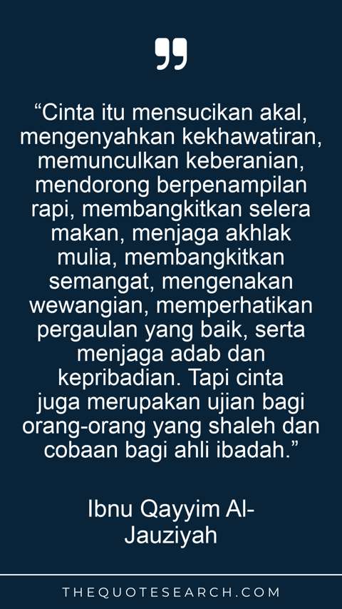 “Cinta itu mensucikan akal, mengenyahkan kekhawatiran, memunculkan keberanian, mendorong berpenampilan rapi, membangkitkan selera makan, menjaga akhlak mulia, membangkitkan semangat, mengenakan wewangian, memperhatikan pergaulan yang baik, serta menjaga adab dan kepribadian. Tapi cinta juga merupakan ujian bagi orang-orang yang shaleh dan cobaan bagi ahli ibadah.”