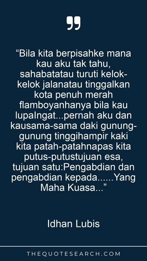 “Bila kita berpisahke mana kau aku tak tahu, sahabatatau turuti kelok-kelok jalanatau tinggalkan kota penuh merah flamboyanhanya bila kau lupaIngat...pernah aku dan kausama-sama daki gunung-gunung tinggihampir kaki kita patah-patahnapas kita putus-putustujuan esa, tujuan satu:Pengabdian dan pengabdian kepada......Yang Maha Kuasa...”