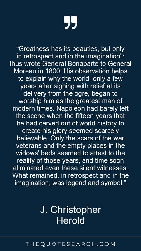 “Greatness has its beauties, but only in retrospect and in the imagination": thus wrote General Bonaparte to General Moreau in 1800. His observation helps to explain why the world, only a few years after sighing with relief at its delivery from the ogre, began to worship him as the greatest man of modern times. Napoleon had barely left the scene when the fifteen years that he had carved out of world history to create his glory seemed scarcely believable. Only the scars of the war veterans and the empty places in the widows' beds seemed to attest to the reality of those years, and time soon eliminated even these silent witnesses. What remained, in retrospect and in the imagination, was legend and symbol.”