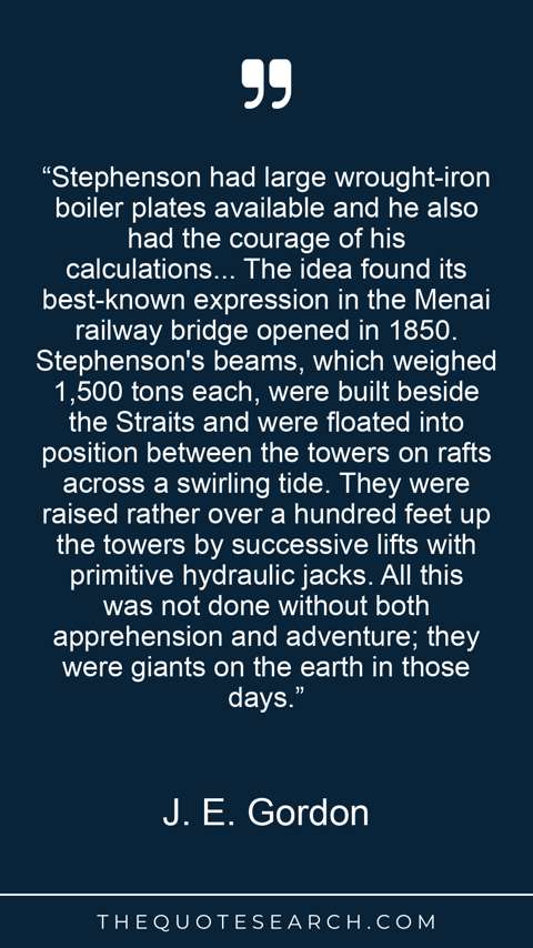 “Stephenson had large wrought-iron boiler plates available and he also had the courage of his calculations... The idea found its best-known expression in the Menai railway bridge opened in 1850. Stephenson's beams, which weighed 1,500 tons each, were built beside the Straits and were floated into position between the towers on rafts across a swirling tide. They were raised rather over a hundred feet up the towers by successive lifts with primitive hydraulic jacks. All this was not done without both apprehension and adventure; they were giants on the earth in those days.”