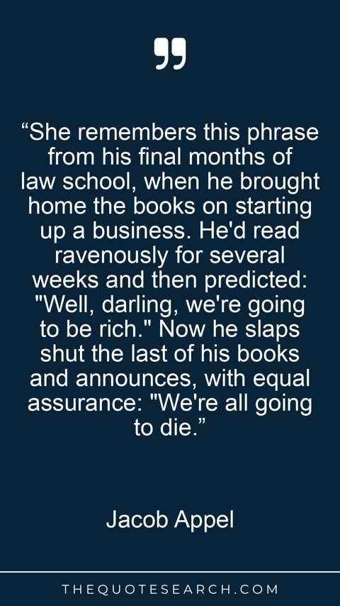 “She remembers this phrase from his final months of law school, when he brought home the books on starting up a business. He'd read ravenously for several weeks and then predicted: "Well, darling, we're going to be rich." Now he slaps shut the last of his books and announces, with equal assurance: "We're all going to die.”