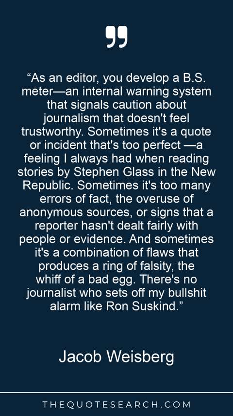 “As an editor, you develop a B.S. meter—an internal warning system that signals caution about journalism that doesn't feel trustworthy. Sometimes it's a quote or incident that's too perfect —a feeling I always had when reading stories by Stephen Glass in the New Republic. Sometimes it's too many errors of fact, the overuse of anonymous sources, or signs that a reporter hasn't dealt fairly with people or evidence. And sometimes it's a combination of flaws that produces a ring of falsity, the whiff of a bad egg. There's no journalist who sets off my bullshit alarm like Ron Suskind.”