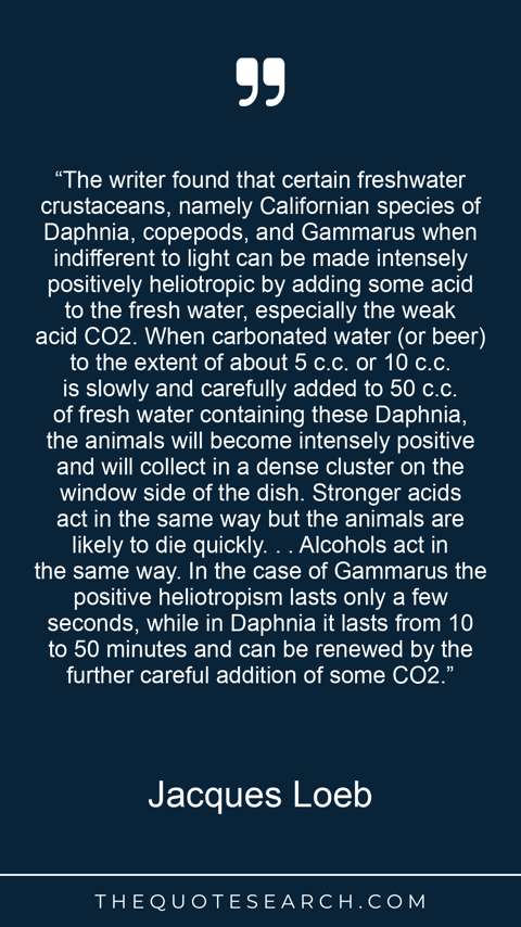 “The writer found that certain freshwater crustaceans, namely Californian species of Daphnia, copepods, and Gammarus when indifferent to light can be made intensely positively heliotropic by adding some acid to the fresh water, especially the weak acid CO2. When carbonated water (or beer) to the extent of about 5 c.c. or 10 c.c. is slowly and carefully added to 50 c.c. of fresh water containing these Daphnia, the animals will become intensely positive and will collect in a dense cluster on the window side of the dish. Stronger acids act in the same way but the animals are likely to die quickly. . . Alcohols act in the same way. In the case of Gammarus the positive heliotropism lasts only a few seconds, while in Daphnia it lasts from 10 to 50 minutes and can be renewed by the further careful addition of some CO2.”