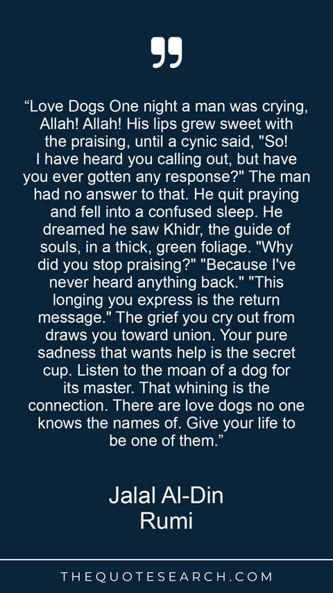“Love Dogs One night a man was crying, Allah! Allah! His lips grew sweet with the praising, until a cynic said, "So! I have heard you calling out, but have you ever gotten any response?" The man had no answer to that. He quit praying and fell into a confused sleep. He dreamed he saw Khidr, the guide of souls, in a thick, green foliage. "Why did you stop praising?" "Because I've never heard anything back." "This longing you express is the return message." The grief you cry out from draws you toward union. Your pure sadness that wants help is the secret cup. Listen to the moan of a dog for its master. That whining is the connection. There are love dogs no one knows the names of. Give your life to be one of them.”