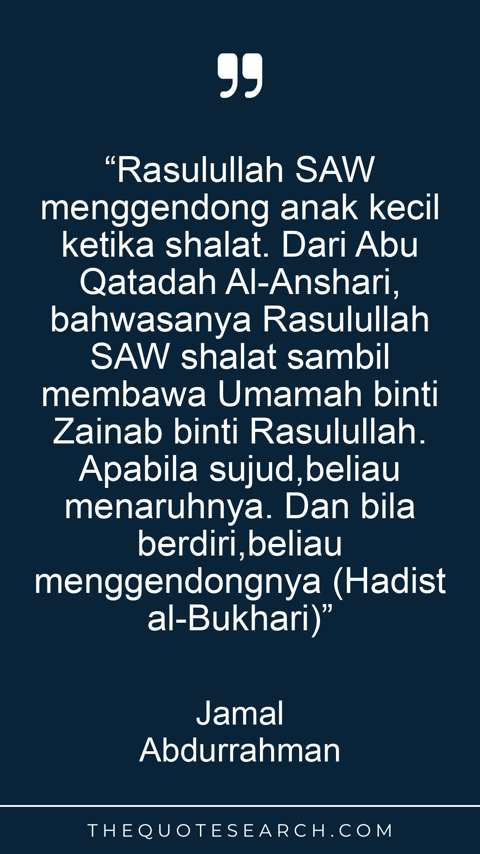 “Rasulullah SAW menggendong anak kecil ketika shalat. Dari Abu Qatadah Al-Anshari, bahwasanya Rasulullah SAW shalat sambil membawa Umamah binti Zainab binti Rasulullah. Apabila sujud,beliau menaruhnya. Dan bila berdiri,beliau menggendongnya (Hadist al-Bukhari)”