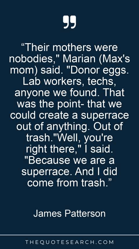 “Their mothers were nobodies," Marian (Max's mom) said. "Donor eggs. Lab workers, techs, anyone we found. That was the point- that we could create a superrace out of anything. Out of trash."Well, you're right there," I said. "Because we are a superrace. And I did come from trash.”
