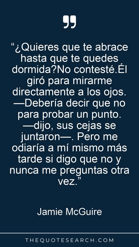 “¿Quieres que te abrace hasta que te quedes dormida?No contesté.Él giró para mirarme directamente a los ojos. —Debería decir que no para probar un punto. —dijo, sus cejas se juntaron—. Pero me odiaría a mí mismo más tarde si digo que no y nunca me preguntas otra vez.”