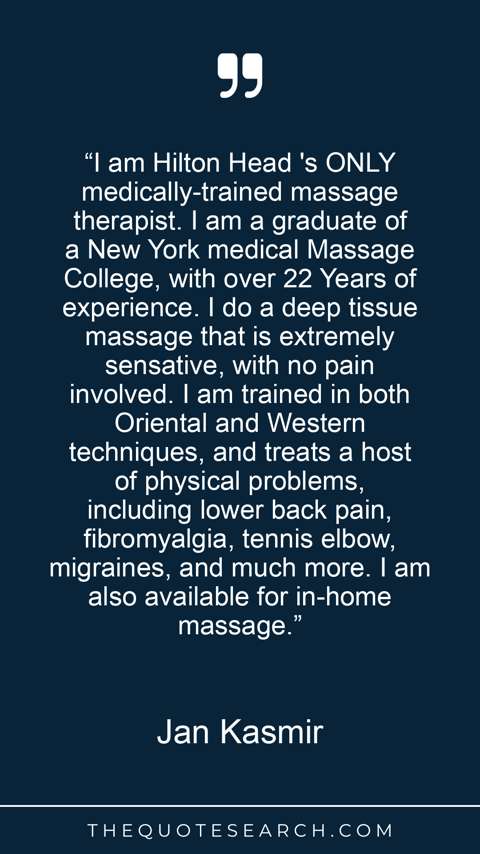 “I am Hilton Head 's ONLY medically-trained massage therapist. I am a graduate of a New York medical Massage College, with over 22 Years of experience. I do a deep tissue massage that is extremely sensative, with no pain involved. I am trained in both Oriental and Western techniques, and treats a host of physical problems, including lower back pain, fibromyalgia, tennis elbow, migraines, and much more. I am also available for in-home massage.”