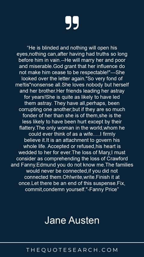“He is blinded and nothing will open his eyes,nothing can,after having had truths so long before him in vain.--He will marry her and poor and miserable.God grant that her influence do not make him cease to be respectable!"---She looked over the letter again."So very fond of me!tis"nonsense all.She loves nobody but herself and her brother.Her friends leading her astray for years!She is quite as likely to have led them astray. They have all,perhaps, been corrupting one another;but if they are so much fonder of her than she is of them,she is the less likely to have been hurt except by their flattery.The only woman in the world,whom he could ever think of as a wife.....I firmly believe it.It is an attachment to govern his whole life. Accepted or refused,his heart is wedded to her for ever.The loss of Mary,I must consider as comprehending the loss of Crawford and Fanny.Edmund you do not know me.The families would never be connected,if you did not connected them.Oh!write,write.Finish it at once.Let there be an end of this suspense.Fix, commit,condemn yourself."-Fanny Price”