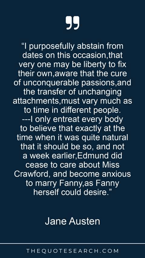 “I purposefully abstain from dates on this occasion,that very one may be liberty to fix their own,aware that the cure of unconquerable passions,and the transfer of unchanging attachments,must vary much as to time in different people.---I only entreat every body to believe that exactly at the time when it was quite natural that it should be so, and not a week earlier,Edmund did cease to care about Miss Crawford, and become anxious to marry Fanny,as Fanny herself could desire.”