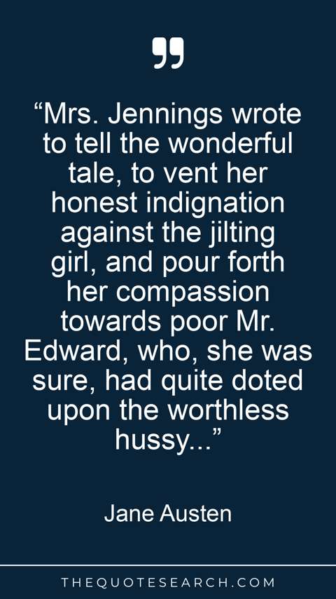 “Mrs. Jennings wrote to tell the wonderful tale, to vent her honest indignation against the jilting girl, and pour forth her compassion towards poor Mr. Edward, who, she was sure, had quite doted upon the worthless hussy...”
