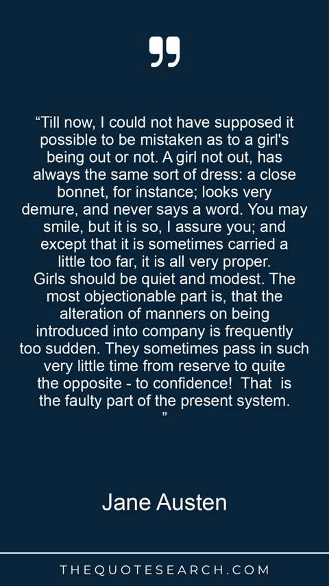 “Till now, I could not have supposed it possible to be mistaken as to a girl's being out or not. A girl not out, has always the same sort of dress: a close bonnet, for instance; looks very demure, and never says a word. You may smile, but it is so, I assure you; and except that it is sometimes carried a little too far, it is all very proper. Girls should be quiet and modest. The most objectionable part is, that the alteration of manners on being introduced into company is frequently too sudden. They sometimes pass in such very little time from reserve to quite the opposite - to confidence! That is the faulty part of the present system. ”