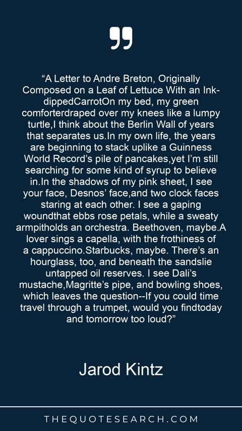 “A Letter to Andre Breton, Originally Composed on a Leaf of Lettuce With an Ink-dippedCarrotOn my bed, my green comforterdraped over my knees like a lumpy turtle,I think about the Berlin Wall of years that separates us.In my own life, the years are beginning to stack uplike a Guinness World Record’s pile of pancakes,yet I’m still searching for some kind of syrup to believe in.In the shadows of my pink sheet, I see your face, Desnos’ face,and two clock faces staring at each other. I see a gaping woundthat ebbs rose petals, while a sweaty armpitholds an orchestra. Beethoven, maybe.A lover sings a capella, with the frothiness of a cappuccino.Starbucks, maybe. There’s an hourglass, too, and beneath the sandslie untapped oil reserves. I see Dali’s mustache,Magritte’s pipe, and bowling shoes, which leaves the question--If you could time travel through a trumpet, would you findtoday and tomorrow too loud?”
