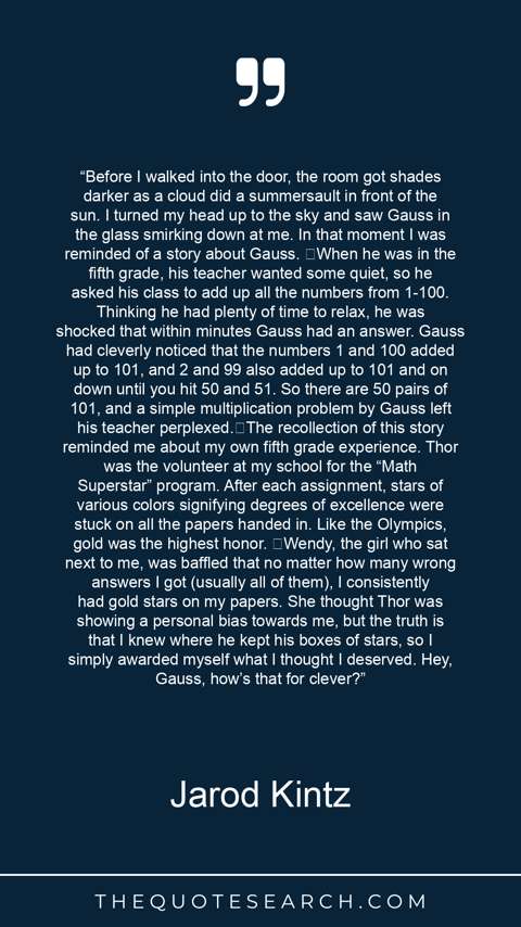 “Before I walked into the door, the room got shades darker as a cloud did a summersault in front of the sun. I turned my head up to the sky and saw Gauss in the glass smirking down at me. In that moment I was reminded of a story about Gauss. When he was in the fifth grade, his teacher wanted some quiet, so he asked his class to add up all the numbers from 1-100. Thinking he had plenty of time to relax, he was shocked that within minutes Gauss had an answer. Gauss had cleverly noticed that the numbers 1 and 100 added up to 101, and 2 and 99 also added up to 101 and on down until you hit 50 and 51. So there are 50 pairs of 101, and a simple multiplication problem by Gauss left his teacher perplexed. The recollection of this story reminded me about my own fifth grade experience. Thor was the volunteer at my school for the “Math Superstar” program. After each assignment, stars of various colors signifying degrees of excellence were stuck on all the papers handed in. Like the Olympics, gold was the highest honor. Wendy, the girl who sat next to me, was baffled that no matter how many wrong answers I got (usually all of them), I consistently had gold stars on my papers. She thought Thor was showing a personal bias towards me, but the truth is that I knew where he kept his boxes of stars, so I simply awarded myself what I thought I deserved. Hey, Gauss, how’s that for clever?”