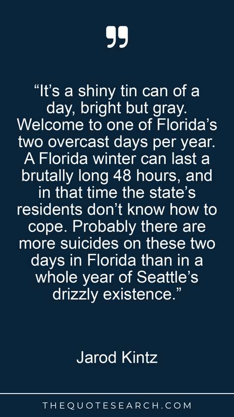 “It’s a shiny tin can of a day, bright but gray. Welcome to one of Florida’s two overcast days per year. A Florida winter can last a brutally long 48 hours, and in that time the state’s residents don’t know how to cope. Probably there are more suicides on these two days in Florida than in a whole year of Seattle’s drizzly existence.”