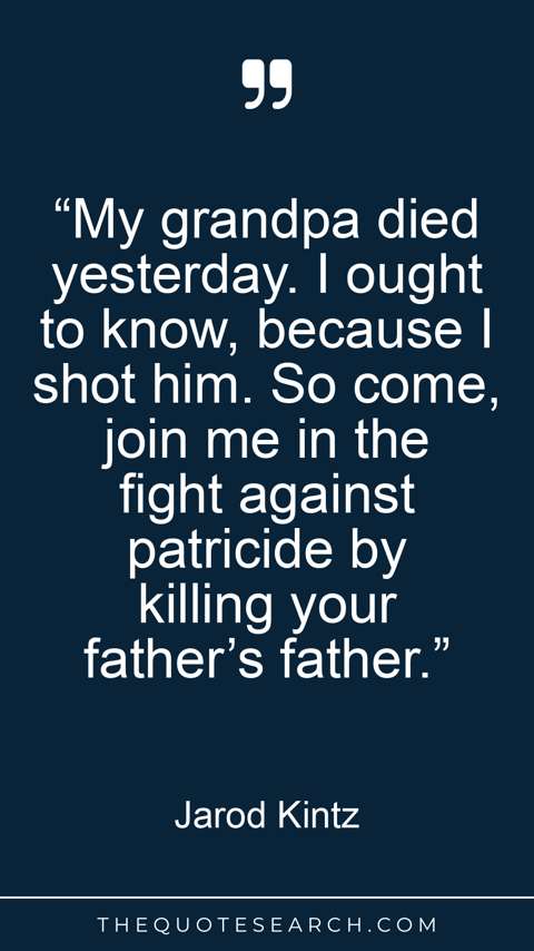 “My grandpa died yesterday. I ought to know, because I shot him. So come, join me in the fight against patricide by killing your father’s father.”