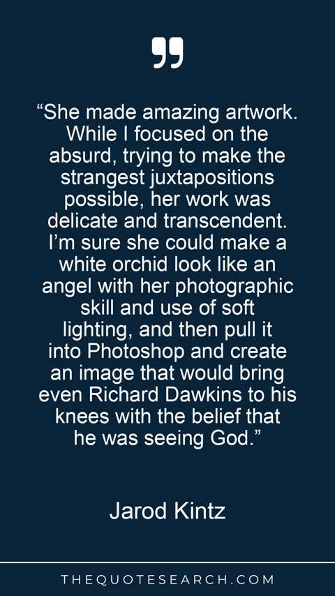 “She made amazing artwork. While I focused on the absurd, trying to make the strangest juxtapositions possible, her work was delicate and transcendent. I’m sure she could make a white orchid look like an angel with her photographic skill and use of soft lighting, and then pull it into Photoshop and create an image that would bring even Richard Dawkins to his knees with the belief that he was seeing God.”