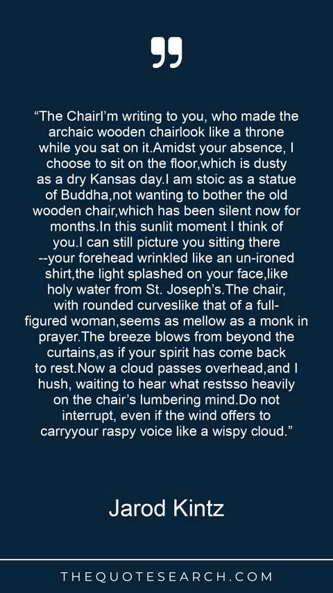 “The ChairI’m writing to you, who made the archaic wooden chairlook like a throne while you sat on it.Amidst your absence, I choose to sit on the floor,which is dusty as a dry Kansas day.I am stoic as a statue of Buddha,not wanting to bother the old wooden chair,which has been silent now for months.In this sunlit moment I think of you.I can still picture you sitting there--your forehead wrinkled like an un-ironed shirt,the light splashed on your face,like holy water from St. Joseph’s.The chair, with rounded curveslike that of a full-figured woman,seems as mellow as a monk in prayer.The breeze blows from beyond the curtains,as if your spirit has come back to rest.Now a cloud passes overhead,and I hush, waiting to hear what restsso heavily on the chair’s lumbering mind.Do not interrupt, even if the wind offers to carryyour raspy voice like a wispy cloud.”