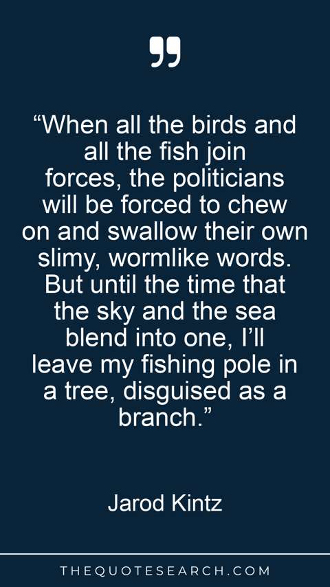 “When all the birds and all the fish join forces, the politicians will be forced to chew on and swallow their own slimy, wormlike words. But until the time that the sky and the sea blend into one, I’ll leave my fishing pole in a tree, disguised as a branch.”