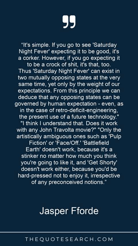 “It's simple. If you go to see 'Saturday Night Fever' expecting it to be good, it's a corker. However, if you go expecting it to be a crock of shit, it's that, too. Thus 'Saturday Night Fever' can exist in two mutually opposing states at the very same time, yet only by the weight of our expectations. From this principle we can deduce that any opposing states can be governed by human expectation - even, as in the case of retro-deficit-engineering, the present use of a future technology." "I think I understand that. Does it work with any John Travolta movie?" "Only the artistically ambiguous ones such as 'Pulp Fiction' or 'Face/Off.' 'Battlefield Earth' doesn't work, because it's a stinker no matter how much you think you're going to like it, and 'Get Shorty' doesn't work either, because you'd be hard-pressed not to enjoy it, irrespective of any preconceived notions.”