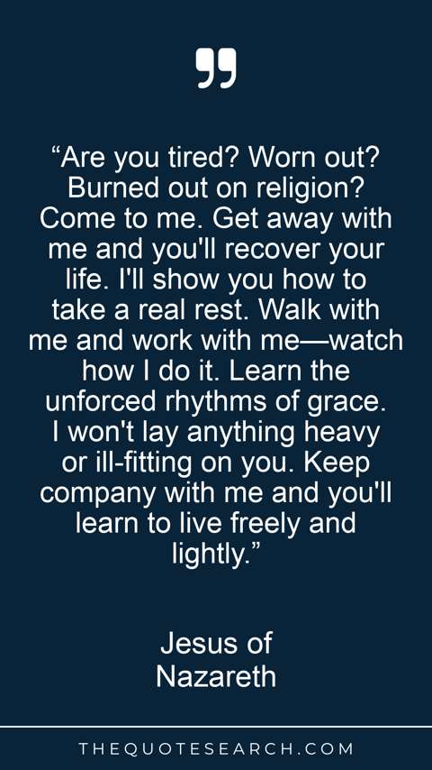 “Are you tired? Worn out? Burned out on religion? Come to me. Get away with me and you'll recover your life. I'll show you how to take a real rest. Walk with me and work with me—watch how I do it. Learn the unforced rhythms of grace. I won't lay anything heavy or ill-fitting on you. Keep company with me and you'll learn to live freely and lightly.”