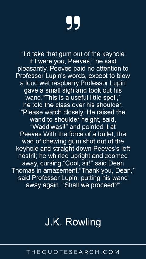“I’d take that gum out of the keyhole if I were you, Peeves,” he said pleasantly. Peeves paid no attention to Professor Lupin’s words, except to blow a loud wet raspberry.Professor Lupin gave a small sigh and took out his wand.“This is a useful little spell,” he told the class over his shoulder. “Please watch closely.”He raised the wand to shoulder height, said, “Waddiwasi!” and pointed it at Peeves.With the force of a bullet, the wad of chewing gum shot out of the keyhole and straight down Peeves’s left nostril; he whirled upright and zoomed away, cursing.“Cool, sir!” said Dean Thomas in amazement.“Thank you, Dean,” said Professor Lupin, putting his wand away again. “Shall we proceed?”