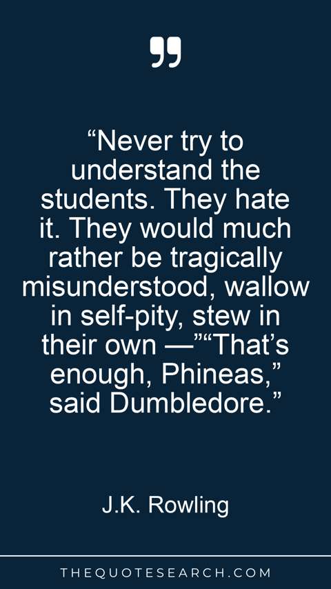 “Never try to understand the students. They hate it. They would much rather be tragically misunderstood, wallow in self-pity, stew in their own —”“That’s enough, Phineas,” said Dumbledore.”