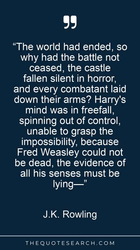 “The world had ended, so why had the battle not ceased, the castle fallen silent in horror, and every combatant laid down their arms? Harry's mind was in freefall, spinning out of control, unable to grasp the impossibility, because Fred Weasley could not be dead, the evidence of all his senses must be lying—”