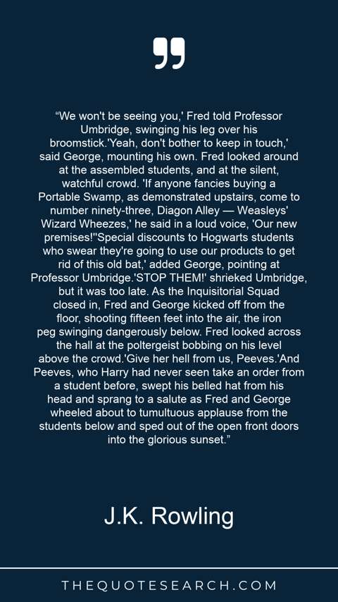 “We won't be seeing you,' Fred told Professor Umbridge, swinging his leg over his broomstick.'Yeah, don't bother to keep in touch,' said George, mounting his own. Fred looked around at the assembled students, and at the silent, watchful crowd. 'If anyone fancies buying a Portable Swamp, as demonstrated upstairs, come to number ninety-three, Diagon Alley — Weasleys' Wizard Wheezes,' he said in a loud voice, 'Our new premises!''Special discounts to Hogwarts students who swear they're going to use our products to get rid of this old bat,' added George, pointing at Professor Umbridge.'STOP THEM!' shrieked Umbridge, but it was too late. As the Inquisitorial Squad closed in, Fred and George kicked off from the floor, shooting fifteen feet into the air, the iron peg swinging dangerously below. Fred looked across the hall at the poltergeist bobbing on his level above the crowd.'Give her hell from us, Peeves.'And Peeves, who Harry had never seen take an order from a student before, swept his belled hat from his head and sprang to a salute as Fred and George wheeled about to tumultuous applause from the students below and sped out of the open front doors into the glorious sunset.”