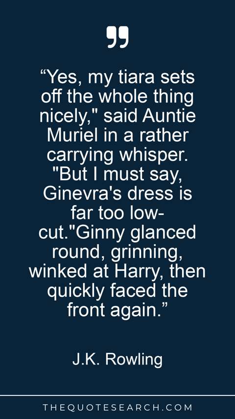 “Yes, my tiara sets off the whole thing nicely," said Auntie Muriel in a rather carrying whisper. "But I must say, Ginevra's dress is far too low-cut."Ginny glanced round, grinning, winked at Harry, then quickly faced the front again.”