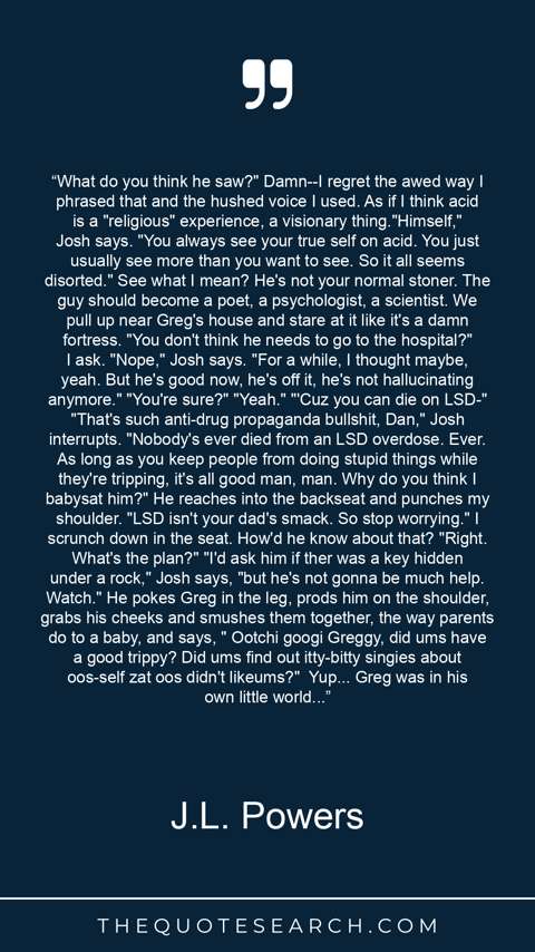 “What do you think he saw?" Damn--I regret the awed way I phrased that and the hushed voice I used. As if I think acid is a "religious" experience, a visionary thing."Himself," Josh says. "You always see your true self on acid. You just usually see more than you want to see. So it all seems disorted." See what I mean? He's not your normal stoner. The guy should become a poet, a psychologist, a scientist. We pull up near Greg's house and stare at it like it's a damn fortress. "You don't think he needs to go to the hospital?" I ask. "Nope," Josh says. "For a while, I thought maybe, yeah. But he's good now, he's off it, he's not hallucinating anymore." "You're sure?" "Yeah." "'Cuz you can die on LSD-" "That's such anti-drug propaganda bullshit, Dan," Josh interrupts. "Nobody's ever died from an LSD overdose. Ever. As long as you keep people from doing stupid things while they're tripping, it's all good man, man. Why do you think I babysat him?" He reaches into the backseat and punches my shoulder. "LSD isn't your dad's smack. So stop worrying." I scrunch down in the seat. How'd he know about that? "Right. What's the plan?" "I'd ask him if ther was a key hidden under a rock," Josh says, "but he's not gonna be much help. Watch." He pokes Greg in the leg, prods him on the shoulder, grabs his cheeks and smushes them together, the way parents do to a baby, and says, " Ootchi googi Greggy, did ums have a good trippy? Did ums find out itty-bitty singies about oos-self zat oos didn't likeums?" Yup... Greg was in his own little world...”