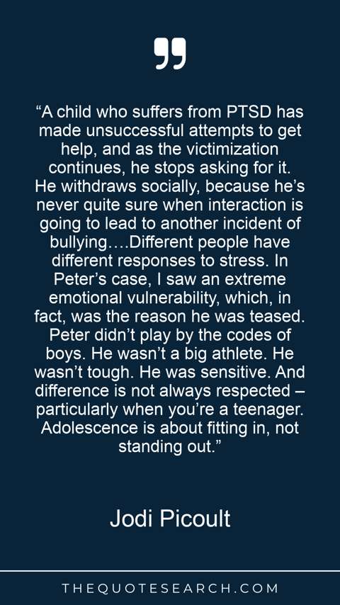“A child who suffers from PTSD has made unsuccessful attempts to get help, and as the victimization continues, he stops asking for it. He withdraws socially, because he’s never quite sure when interaction is going to lead to another incident of bullying….Different people have different responses to stress. In Peter’s case, I saw an extreme emotional vulnerability, which, in fact, was the reason he was teased. Peter didn’t play by the codes of boys. He wasn’t a big athlete. He wasn’t tough. He was sensitive. And difference is not always respected – particularly when you’re a teenager. Adolescence is about fitting in, not standing out.”