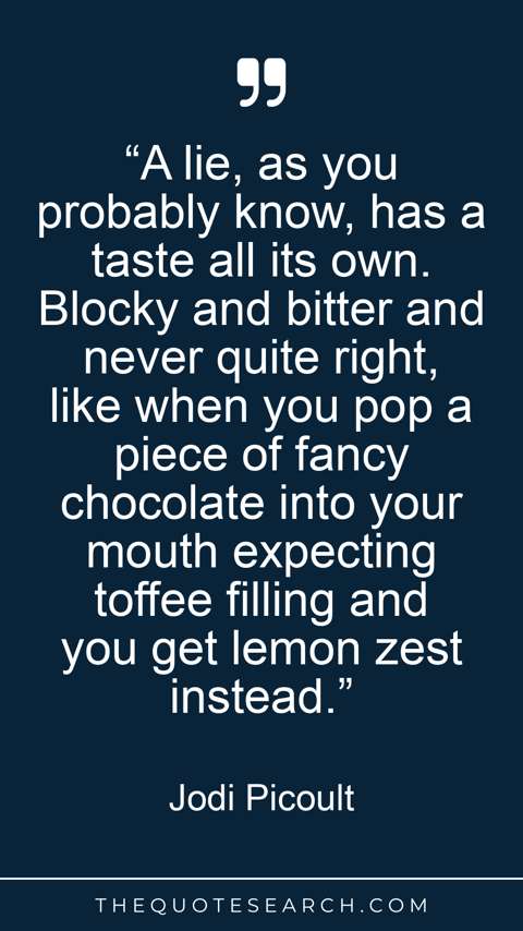 “A lie, as you probably know, has a taste all its own. Blocky and bitter and never quite right, like when you pop a piece of fancy chocolate into your mouth expecting toffee filling and you get lemon zest instead.”