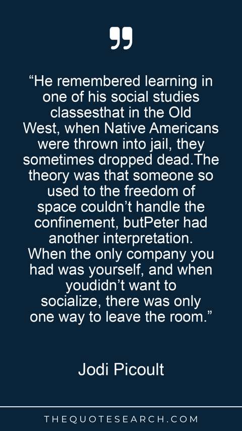 “He remembered learning in one of his social studies classesthat in the Old West, when Native Americans were thrown into jail, they sometimes dropped dead.The theory was that someone so used to the freedom of space couldn’t handle the confinement, butPeter had another interpretation. When the only company you had was yourself, and when youdidn’t want to socialize, there was only one way to leave the room.”