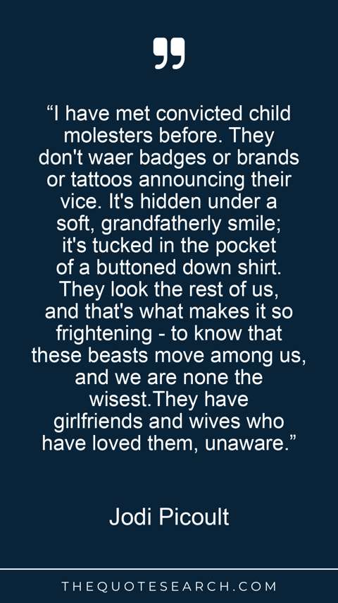 “I have met convicted child molesters before. They don't waer badges or brands or tattoos announcing their vice. It's hidden under a soft, grandfatherly smile; it's tucked in the pocket of a buttoned down shirt. They look the rest of us, and that's what makes it so frightening - to know that these beasts move among us, and we are none the wisest.They have girlfriends and wives who have loved them, unaware.”