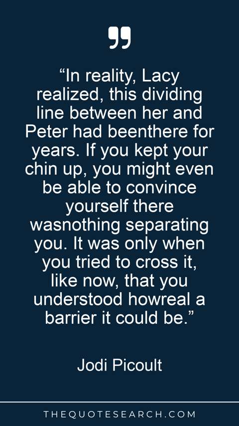 “In reality, Lacy realized, this dividing line between her and Peter had beenthere for years. If you kept your chin up, you might even be able to convince yourself there wasnothing separating you. It was only when you tried to cross it, like now, that you understood howreal a barrier it could be.”
